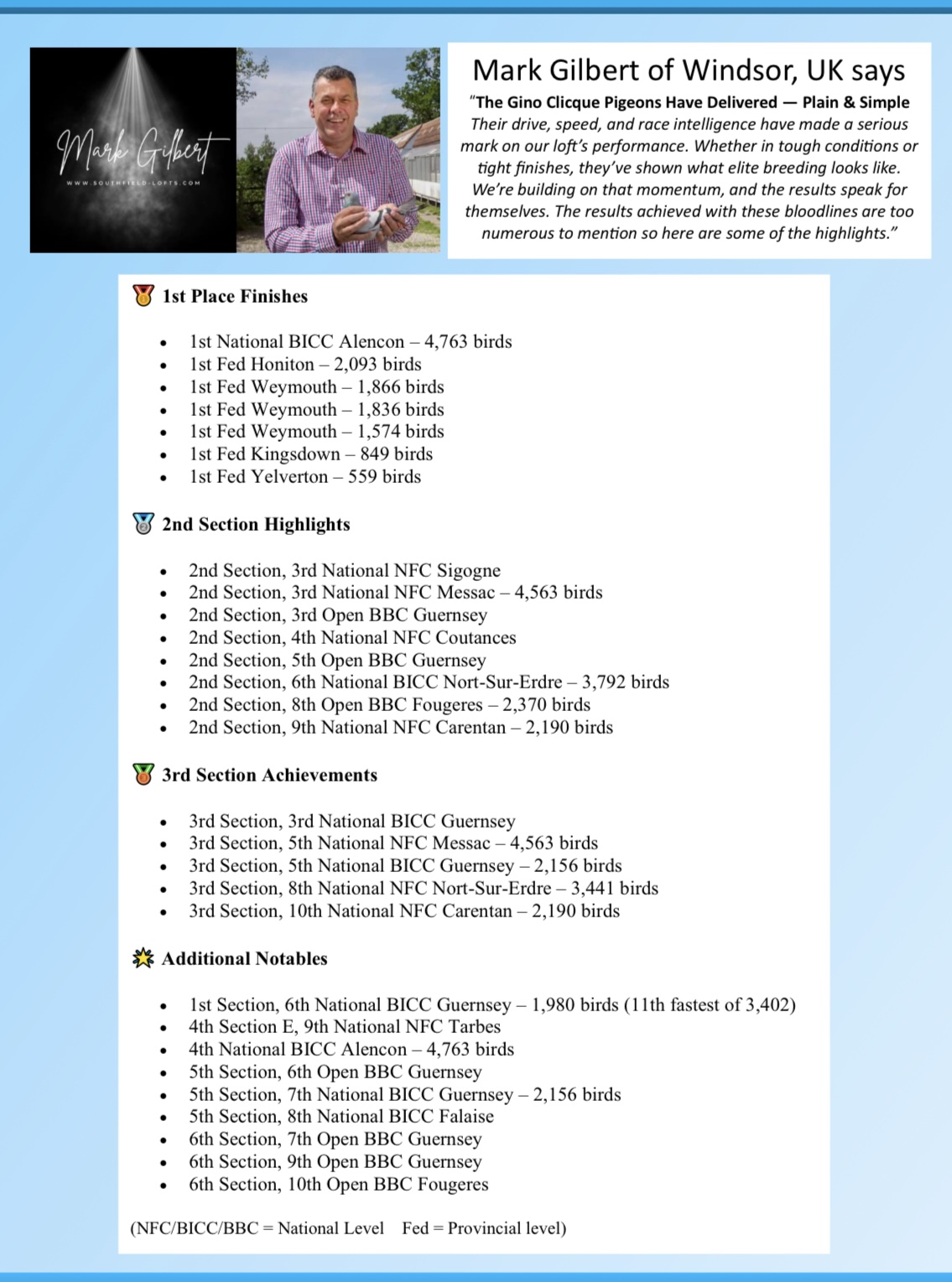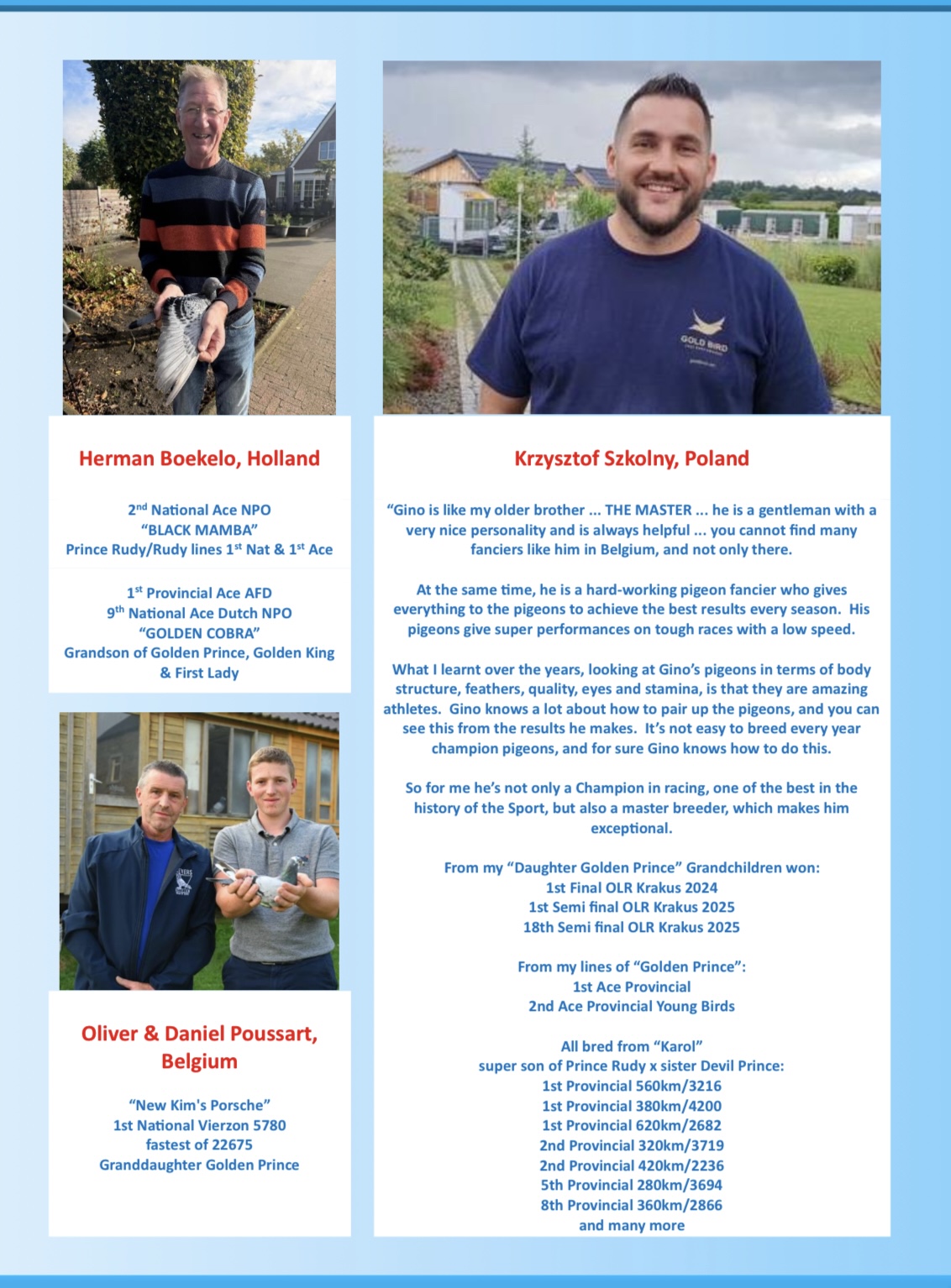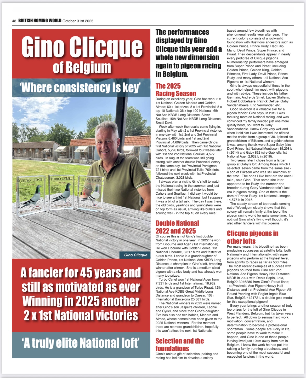 The collection of National Ace Pigeons, National winners and Zonal/Provincial stars of Gino Clicque is immense. Pigeons such as Piraat, Super Prince, Golden Prince and Prince Rudy have a legendary status that reaches far beyond the Belgian border. New generations of National Ace Pigeons have kept Gino at the top … the most noteworthy achievements in 2022 are the 1st Int. Agen Yearlings against 16,932 b and 1st Fastest Libourne against 6,309 b and another DOUBLE NATIONAL WIN in 2025 with 1st National Souillac 4,577 b and 1st National Cahors 5,226 b.