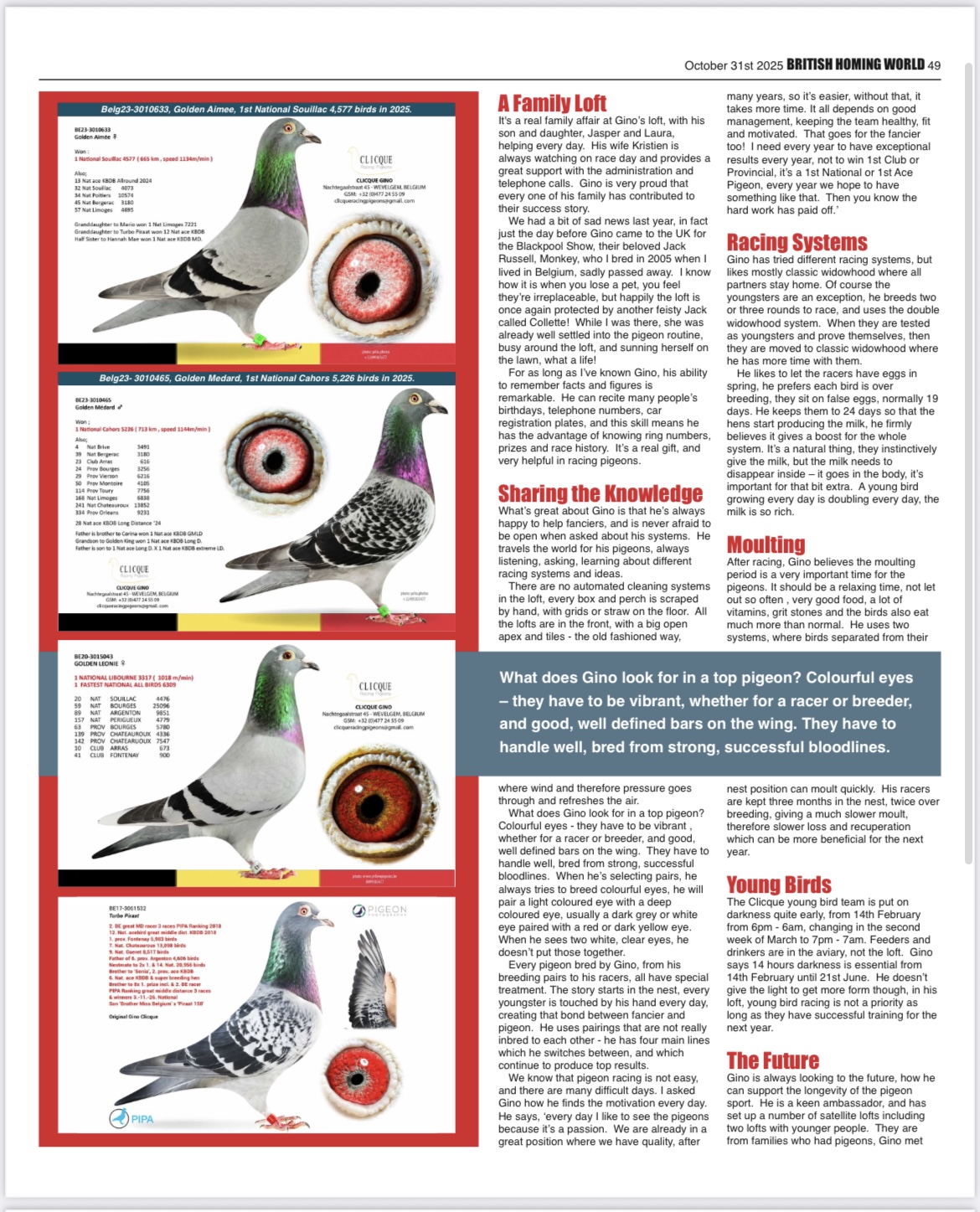 We could go on and on about the spectacular results which are achieved at Gino’s lofts and elsewhere with his stock, the list is endless. The fact is that Gino Clicque belongs to the world’s best fanciers, and owns a colony that is unmatched when it comes to spectacular performances.