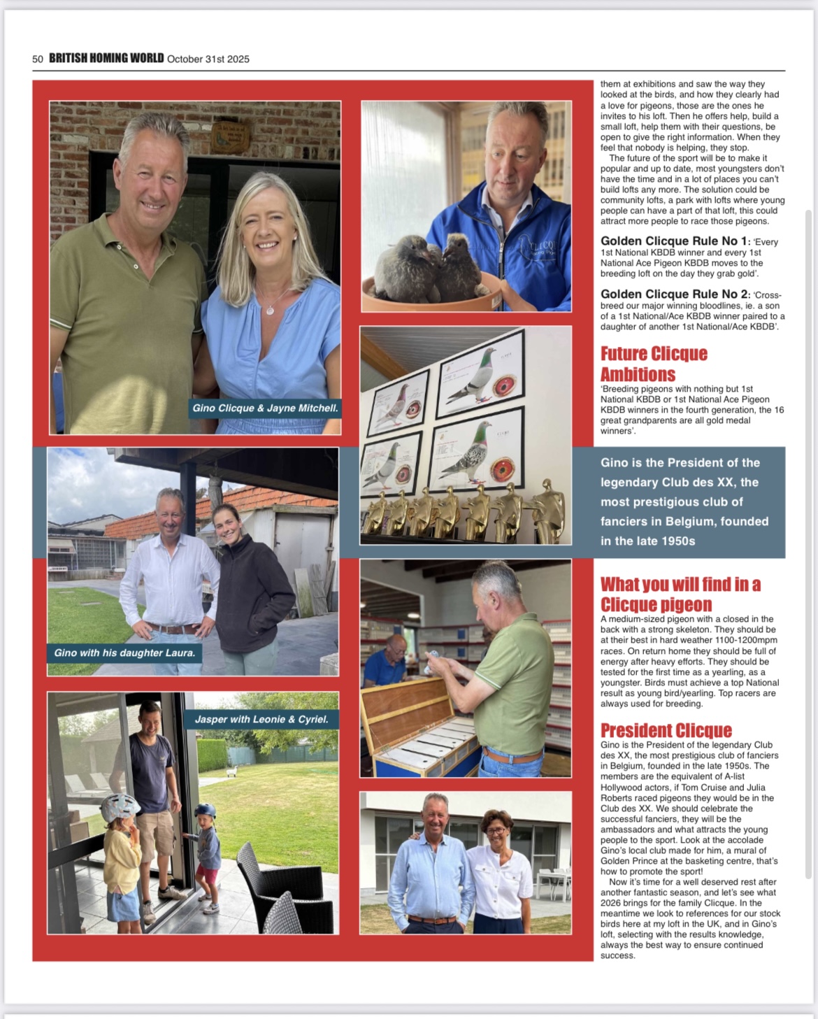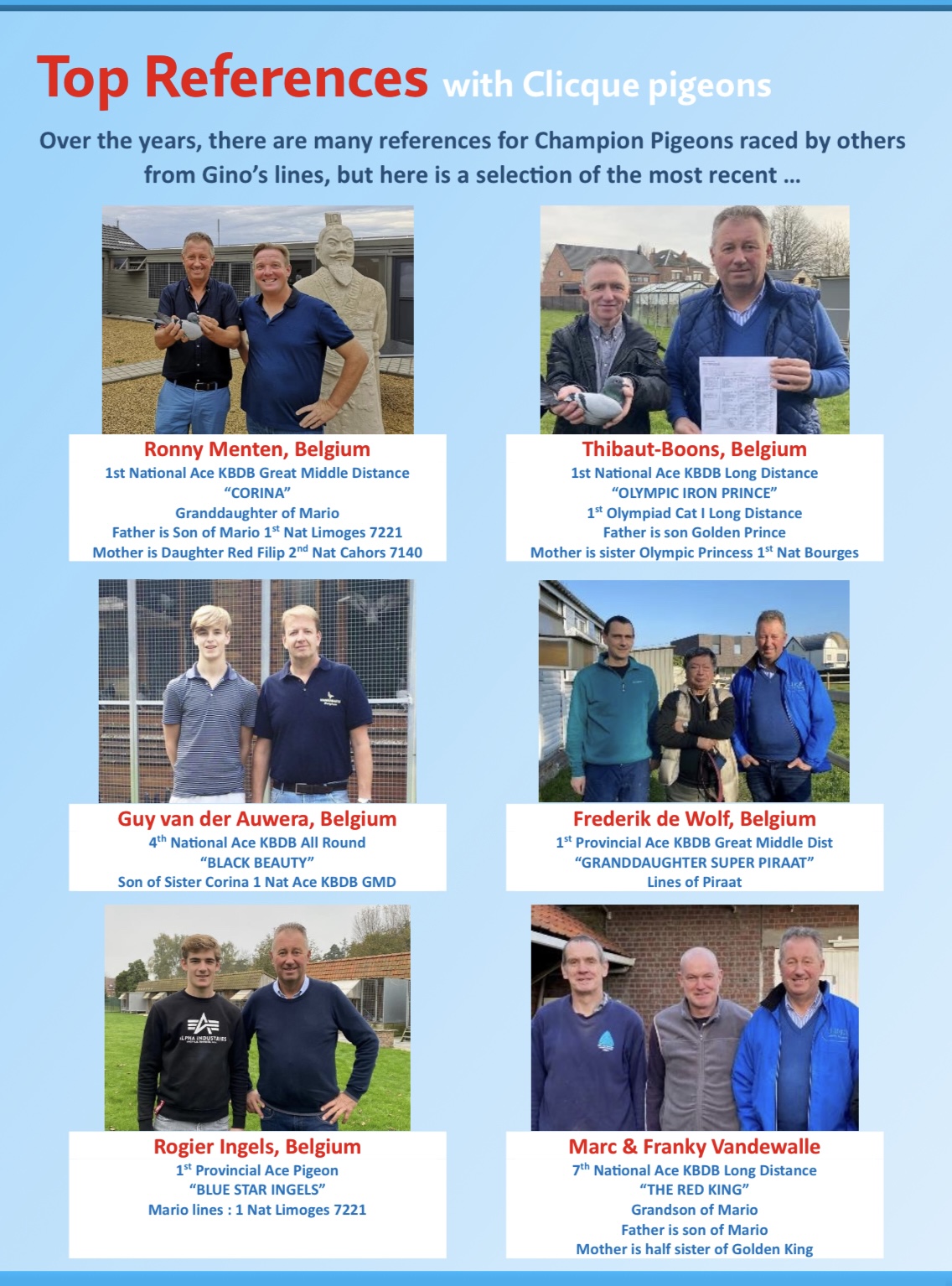 Each year, the Clicque household receives countless references of top results achieved in other lofts. Several youngsters are placed on different lofts around Belgium each year, which result in some noteworthy references, also in 2022: at Thibaut-Boons; winner of the title Long Distance Champion of Belgium on the long distance with 1+2 nominated is won for 50% by direct Clicque pigeons. This combination also won a handful of national ace pigeon titles with their Clicque pigeons! Annemie Vanhee won 1st National Tulle with a 100% Clicque pigeon. Paul Gevaert won 1st Prov. Ace Pigeon KBDB with a Clicque youngster. Frederik Dewolf won 1st Prov. Ace Pigeon Heavy Middle Distance in 2021 with a Clicque pigeon. Van De Walle Marc & Franky won 7th Nat. Ace Pigeon Long Distance KBDB thanks to Gino’s pigeons. The last 6 years, 18 Clicque pigeons won National Top 10 prizes at Ronny Menten …