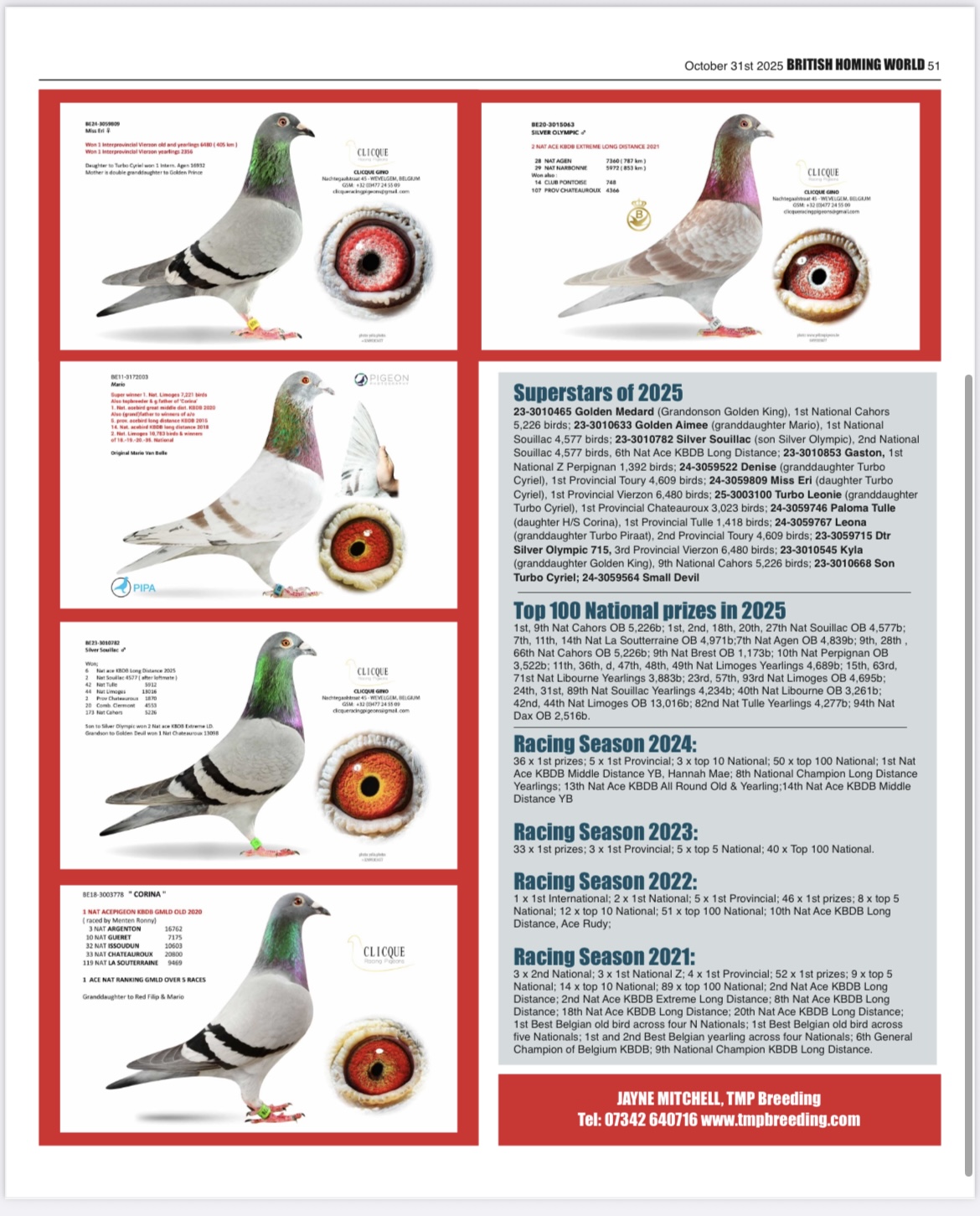 The TMP Breeding Loft houses breeding pairs of direct Gino Clicque pigeons (winner of 11 x 1st (Inter)Nationals) including sons, daughters and very close relatives of his main champion lines the pigeons mentioned below, ie the TOP of the TOP !!!