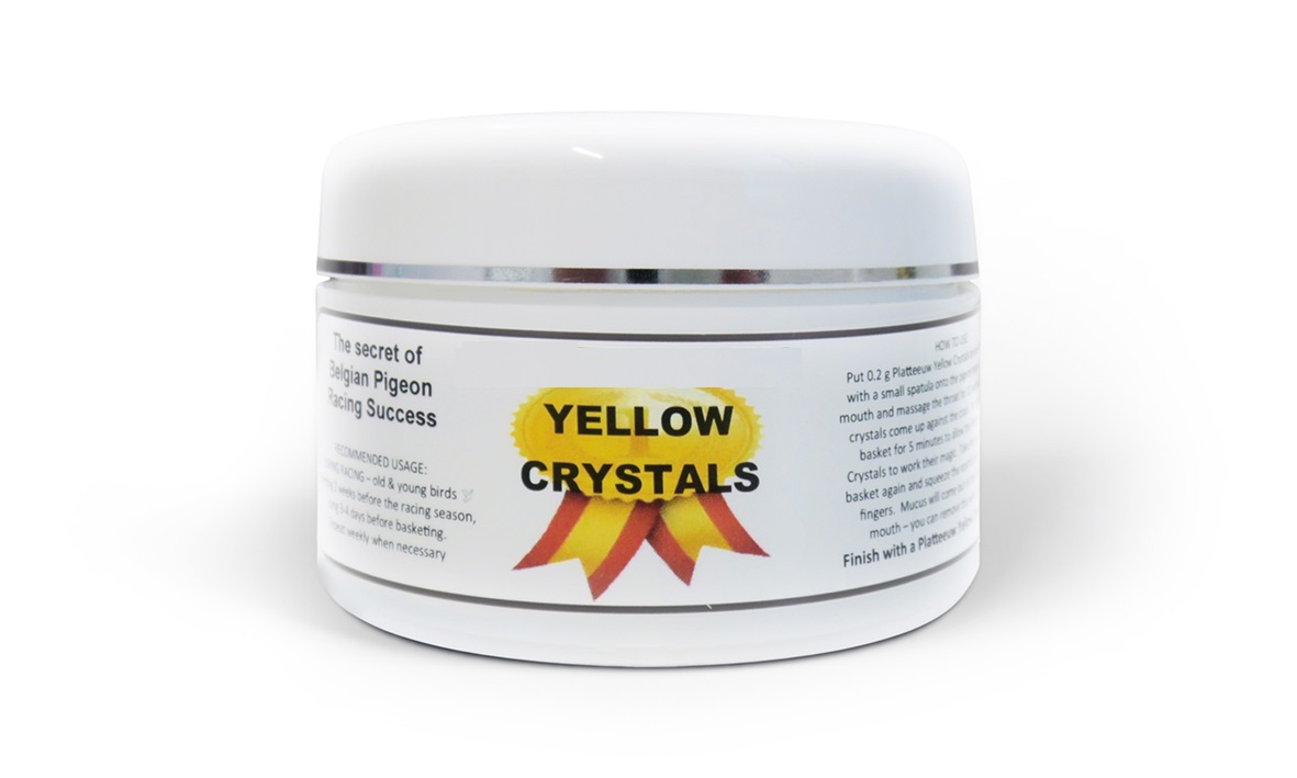 Winner of 10 x 1st Nationals says: “Every week, 3 days before basketing, I use the YELLOW CRYSTALS on every one of my race team.  It is essential that the birds have a clear head – to oxygenate and orientate – I am 100% convinced that this is essential for a good result, and a speedy recovery for the next week.  You will be amazed at how much mucus comes out of the head !”